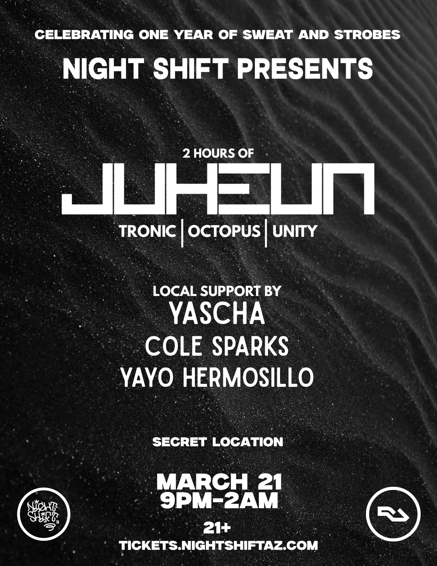 Originally from New Mexico, currently residing in Phoenix, techno titan Juheun is coming to Tucson to bring a boundary-pushing blend of sounds old and new. Juheun’s performance commands attention, high energy, and mystique. If you’ve never seen him play before, you are in for one unforgettable experience.