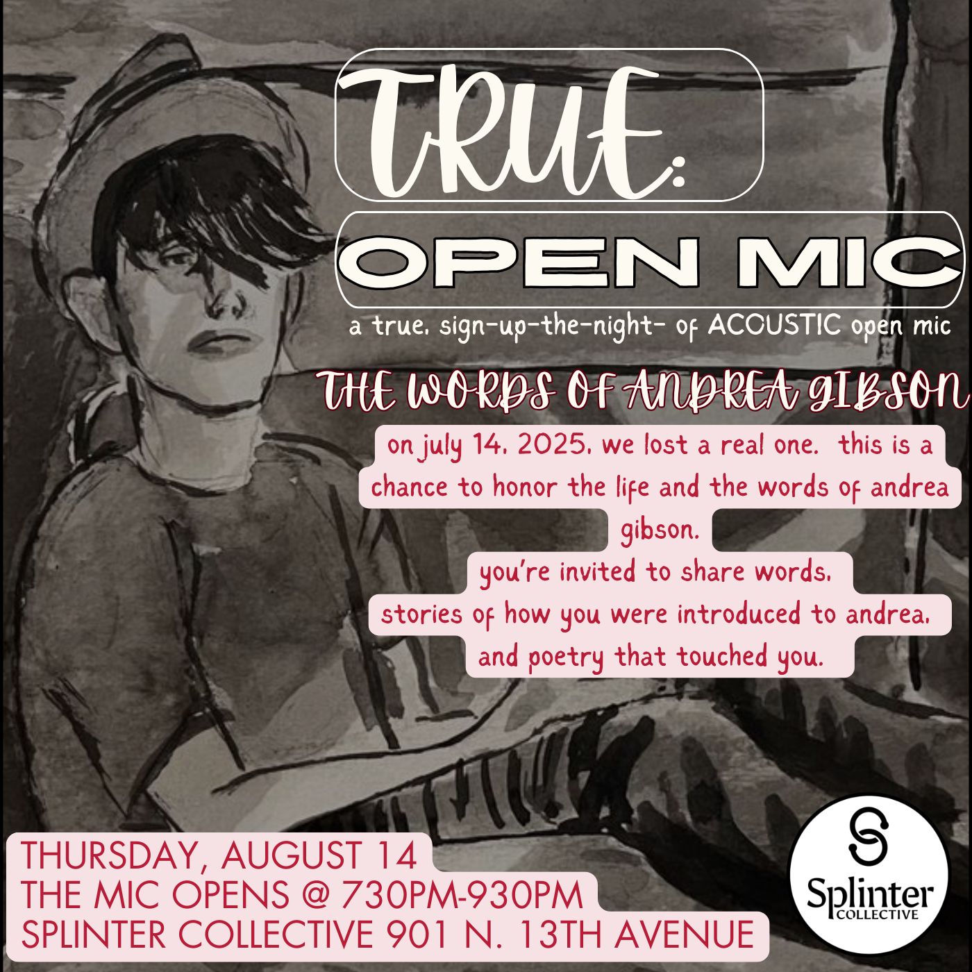 ✨TRUE: open mic ✨- an ACOUSTIC open mic. june 12 in the green room at splinter w special guest: roux!! here's a link to her music theme: the words of queer folks. share your words (if you're queer) or the words of a queer person the mic opens at 730pm- 930pm. don’t miss it! this ... Read more