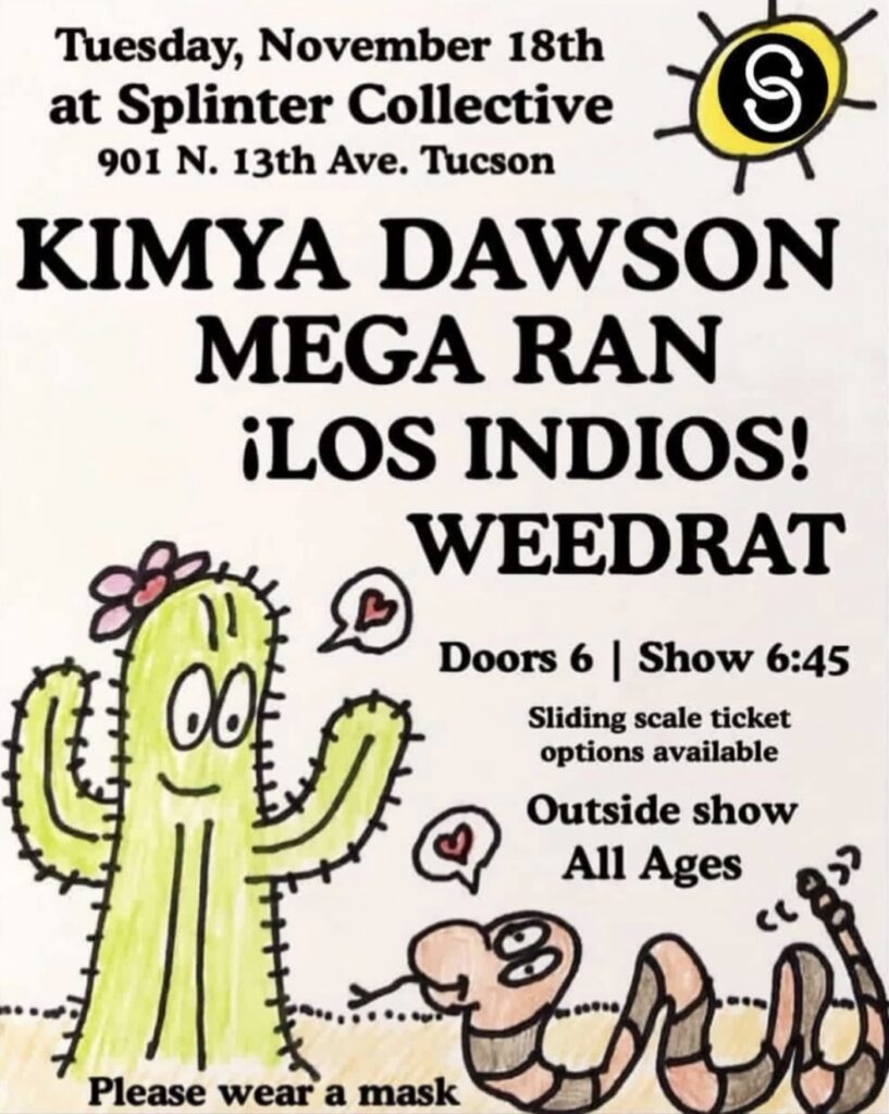 Kimya Dawson in Tucson!! with Weed Rat, ¡Los Indios!, and Mega Ran November 18th Doors at 6 “Kimya Dawson (she/they), formerly one half of the Moldy Peaches, is a singer/songwriter known for their quirky, innocent, cheerful songs that often carry overarching themes of crushing despair and disaffection. Dawson often takes highly adult emotional themes and presents them as cutesy campfire songs.”-https://genius.com/artists/Kimya-dawson “Tayamni GoodShield & AKII WENSII, aka ¡Los Indios! Are a Tucson-based Ojibwe & Oglala Lakota duo with a mission ...